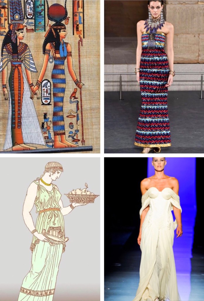 Karl Lagerfeld used inspiration from Ancient Egypt women’s costumes for Chanel’s pre-fall 2019 M’etiers d’ Art collection, as demonstrated by the below. He incorporated a simple tunic style dress, decorated all over with a woven pattern and complemented this with heavy jewelry. These designs and fashion features can clearly be seen in wall paintings from ancient Egypt.