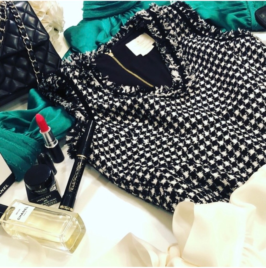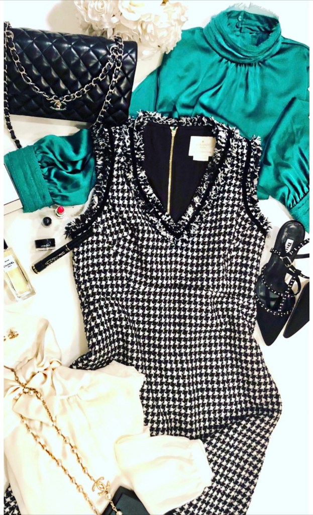 A classic tweed dress, a wardrobe staple, is paired with a beautiful timeless cream silk blouse, exuding style and elegance, a dress that can also be paired with many other tops, such as the green one, creating a pop of colour! The image creates a lifestyle, with the accessories and allows the reader to imagine themselves creating different looks with the tweed dress and draws them into exploring product details.